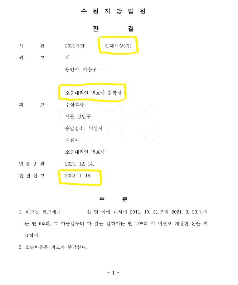 2022년 1월 18일 기획부동산 사기 손해배상 건과 관련하여, 전부 승소를 하였습니다.
