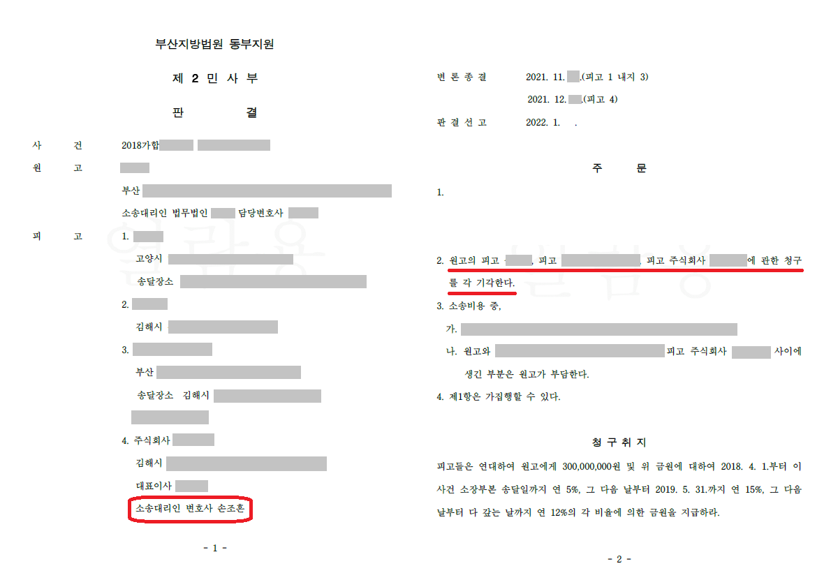 법원은 손조흔 변호사의 주장을 모두 받아들여, 의뢰인 회사에 대한 원고의 3억 원 청구를 전부 기각하였고, 소송비용도 원고가 부담하는 판결을 선고하였습니다.