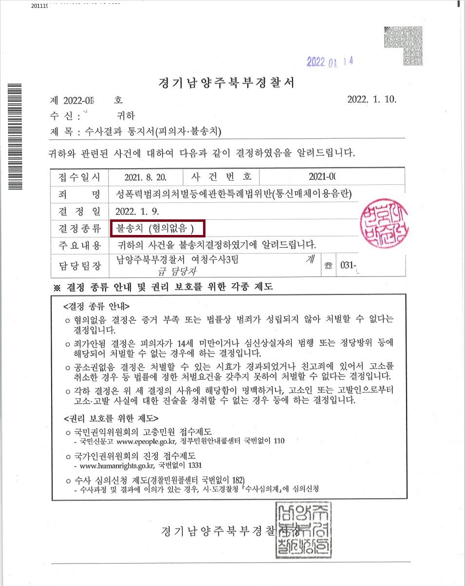 성폭법(통신매체이용음란) 불송치결정 (혐의없음)