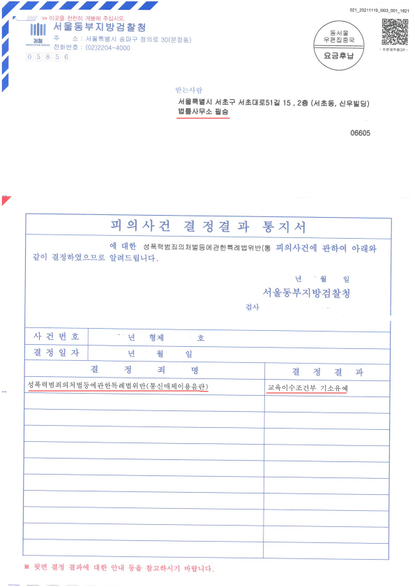 나아가 의뢰인님께서는 가족들과 함께 거주 중인 상황이었으며, 검찰의 처분통지서, 법원의 판결문 등이 가족분들이 계신 주소지로 송달될 수 있는 상황이었습니다. 따라서 수사단계에서부터 송달지변경신청을 하여 처분통지서나 판결문 등 일체의 우편물을 저희 사무실로 송달되도록 처리하였습니다.