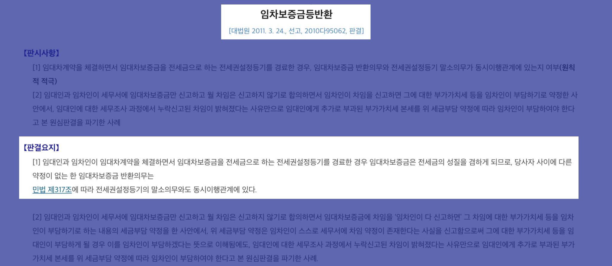 대법원 2010다95062 임차보증금 등 반환 사건의 판결을 근거로 이 부동산은 전세권 설정 등기가 되어 있으므로 임차인이 전세권 말소 등기와 임대인이 임대차보증금 반환 의무는 동시이행을 해야 하기 때문에 지연이자는 줄 수 없습니다! 라고 법정에서 항변해야 했으나, 항변을 전혀 하지 않아 지급하지 않아도 되는 지연이자라는 돈을 지급하게 되었죠.