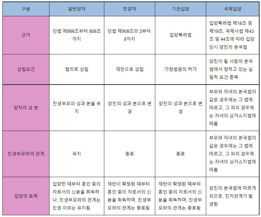 입양은 법적으로 친자관계가 없는 사이에 가정법원의 허가를 구해 법률적으로 친자관계를 맺는 행위를 말하는 것으로 입양신고로 양부모와 양자 사이에는 법적 친자관계가 생기게 되면 부양이나 상속 등에서 자연혈족의 경우와 동일한 권리가 인정됩니다.