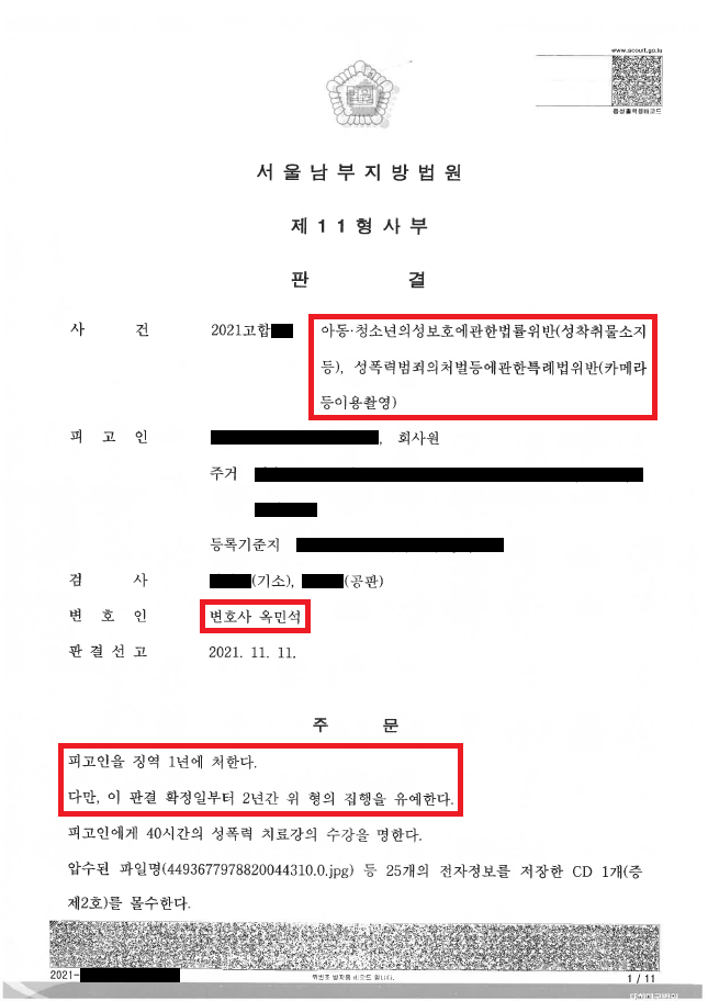 이러한 저의 조력을 바탕으로 A씨는 '로리대장 태○'이 운영하는 텔레그램 대화방에서 약 1년간 활동하며 문형○(일명 '갓갓')이 제작하여 유포한 'N번방' 아동·청소년성착취물을 다운로드받은 것도 모자라 불법 촬영까지 하고 피해자들과 합의하지 못하였음에도 불구하고 집행유예를 선고받고 신상정보공개·고지 및 취업제한 명령도 면제받음으로써 일생일대의 위기 상황에서 벗어날 수 있었습니다.