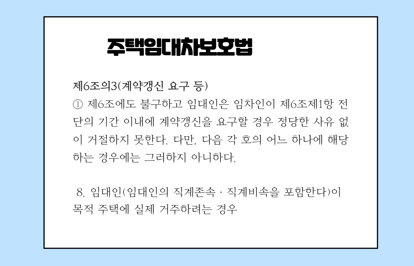 3. 임대인은 '임대인이 목적 주택에 실제 거주하려는 경우' 임차인의 계약갱신요구를 거절할 수 있다(제6조의3 제1항 단서 제8호). 그런데 위와 같은 사유는 그 사유 자체가 아직 발생하지 아니한 장래의 사태에 관한 임대인의 주관적인 의도를 그 내용으로 하고 있어서 임차인 측에서 예측하거나 그 사유 발생여부를 정확히 알기 어려운 사정이 있어 이를 제한없이 인정한다면 위 사유로 인한 거절이 남용되어 사실상 계약갱신요구권의 의미가 없어질 우려가 있는 바 '실제 거주하려는 의사'를 인정하기에 의심스러운 사정이 존재하는 경우에는 입증책임을 부담하는 임대인에게 그 불이익이 돌아갈 수 밖에 없다.