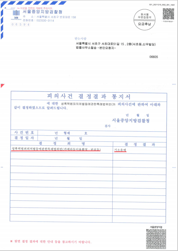 나아가 의뢰인님께서는 가족들과 함께 거주 중인 상황이었으며, 검찰의 처분통지서, 법원의 판결문 등이 가족분들이 계신 주소지로 송달될 수 있는 상황이었습니다. 따라서 수사단계에서부터 송달지변경신청을 하여 처분통지서나 판결문 등 일체의 우편물을 저희 사무실로 송달게끔 처리하였습니다.