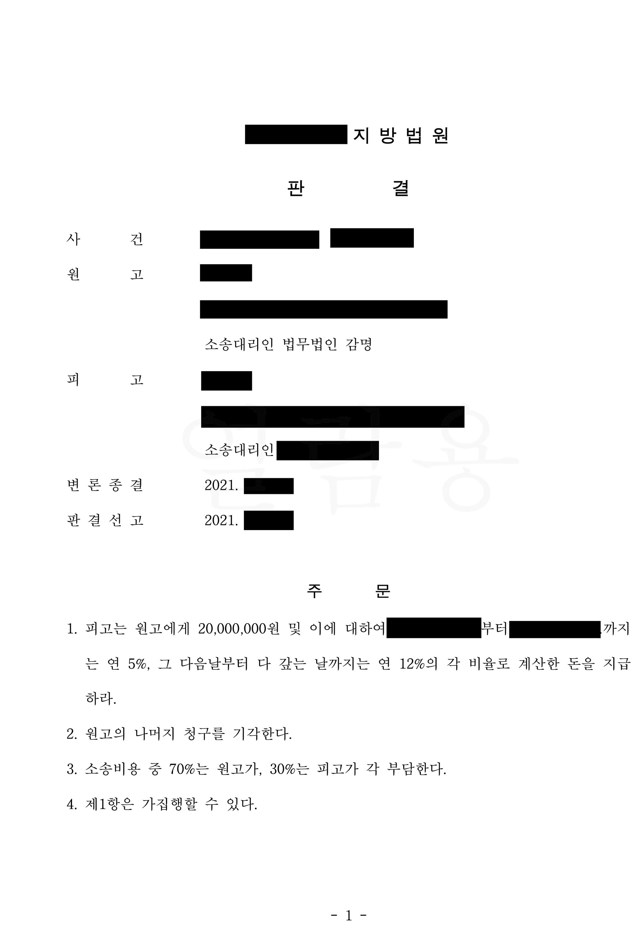 법원은 원고 측이 주장한 원고와 주세진의 혼인기간, 피고와 소외인의 부정행위의 내용과 그 기간, 위 부정행위가 원고와 소외인의 혼인관계에 미친 영향, 부정행위가 발각된 이후 피고가 원고에게 보인 태도와 현재까지의 상황 등 이 사건 변론에 나타난 여러 사정들을 참작하여 피고는 원고에게 2,000만 원을 지급할 것을 명하였습니다.