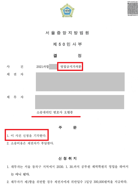 - 위 사건의 경우도 공무원 수험생들의 밀집지역이 노량진 일대에서 10년간 공무원 체력학원 영업의 금지, 위반 시 1일 30만원의 간접강제를 청구하였으나, 상대방과 치열한 다툼을 한 끝에 업주의 청구를 기각시켜 근로자가 승소할 수 있었습니다.