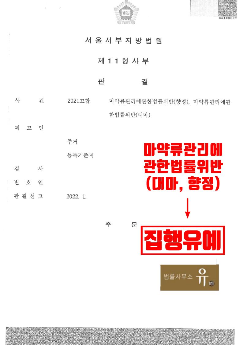 서울서부지방법원은 범행 당시의 정황 및 피고인(의뢰인)이 반성하고 있는 점 등에 대해 상세하게 부각하여 정리한 법률사무소 유(唯) 마약전문변호사의 변호인의견서 등의 내용을 대폭 수용하여 피고인(의뢰인)에게 집행유예를 선고하였습니다.