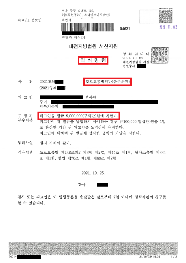 이러한 저의 조력을 바탕으로 A씨는 음주운전 이진아웃으로서 재판까지 나아가 징역형으로 처벌받게 될 가능성이 매우 높았음에도 불구하고 약식명령 벌금형을 선고받음으로써 구공판되어 재판까지 나아가지 않고 회사에서 당연퇴직하게 될 위기에서 벗어날 수 있었습니다.