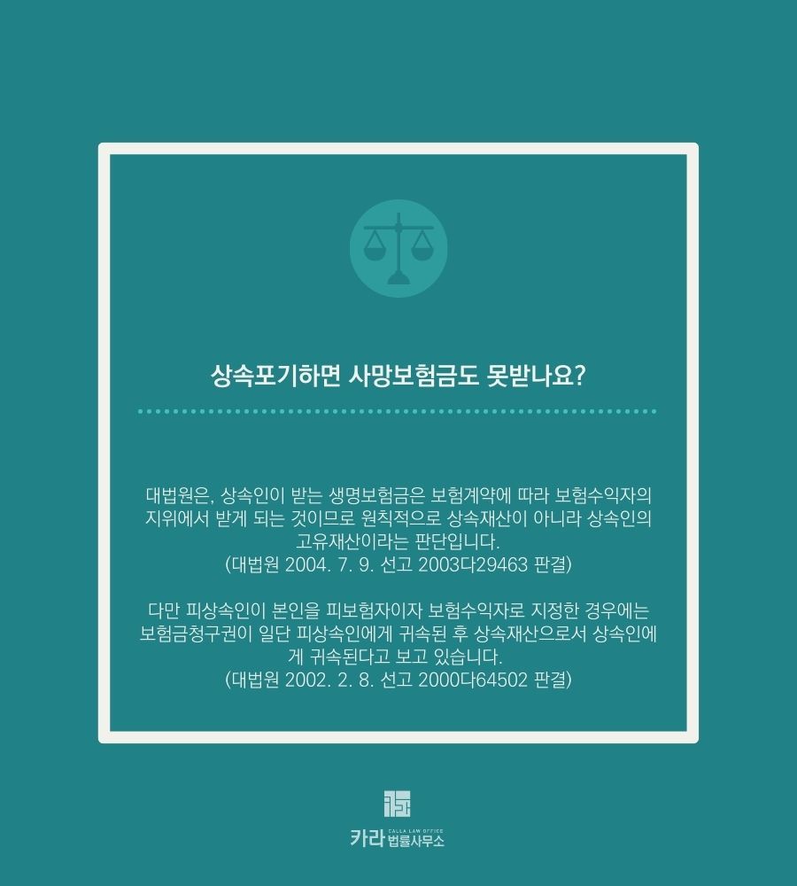 즉 상속인이 상속을 포기했다는 것은 상속재산에 대한 일체의 권리를 포기하는 것이므로 보험금 역시 포기한다는 의미는 아닙니다.