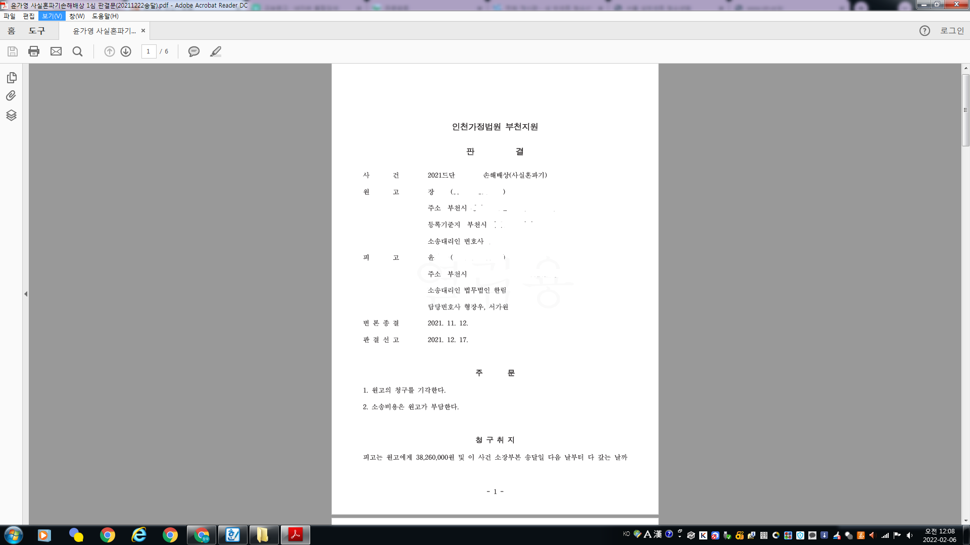 원고는 사실혼 관계를 피고가 깼으니 위자료와 결혼식 비용(예식장 등등) 합계 약 3,800여 만 원을 청구하였고, 피고는 사실혼관계가 아니다, 설사 사실혼이라 하여도 원고의 잘못으로 사실혼이 깨졌다..그러니 원고 주장은 잘못되었다...라고 주장하였습니다.