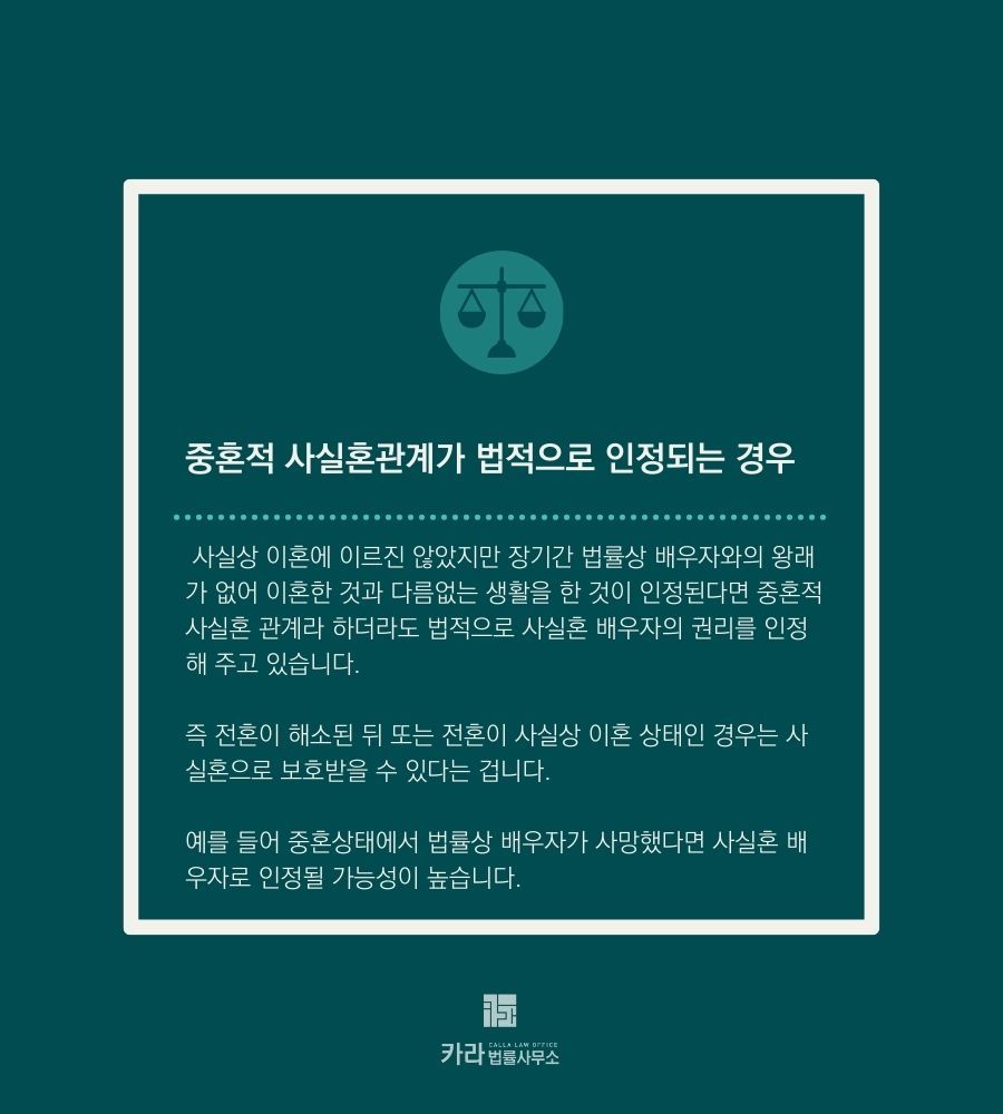 사실상 이혼에 이르진 않았지만 장기간 법률상 배우자와의 왕래가 없어 이혼한 것과 다름없는 생활을 한 것이 인정된다면 중혼적 사실혼 관계라 하더라도 법적으로 사실혼 배우자의 권리를 인정해 주고 있습니다.