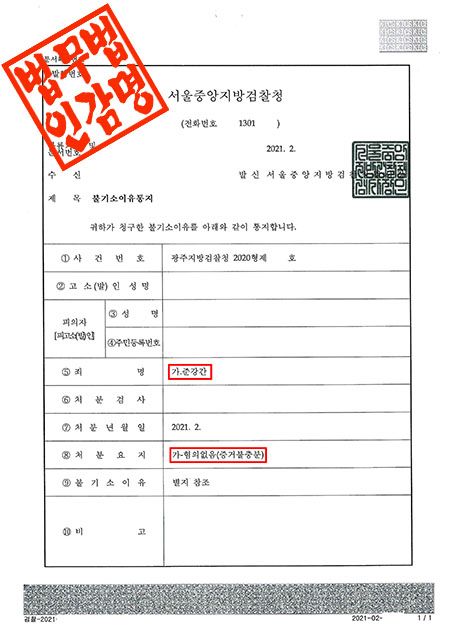 광주지방검찰청은 이 사건에 대해 다음과 같은 사유로 불기소 처분을 하였습니다.