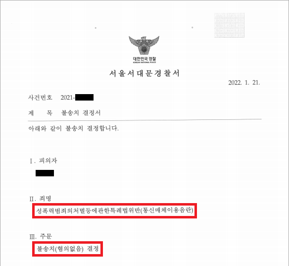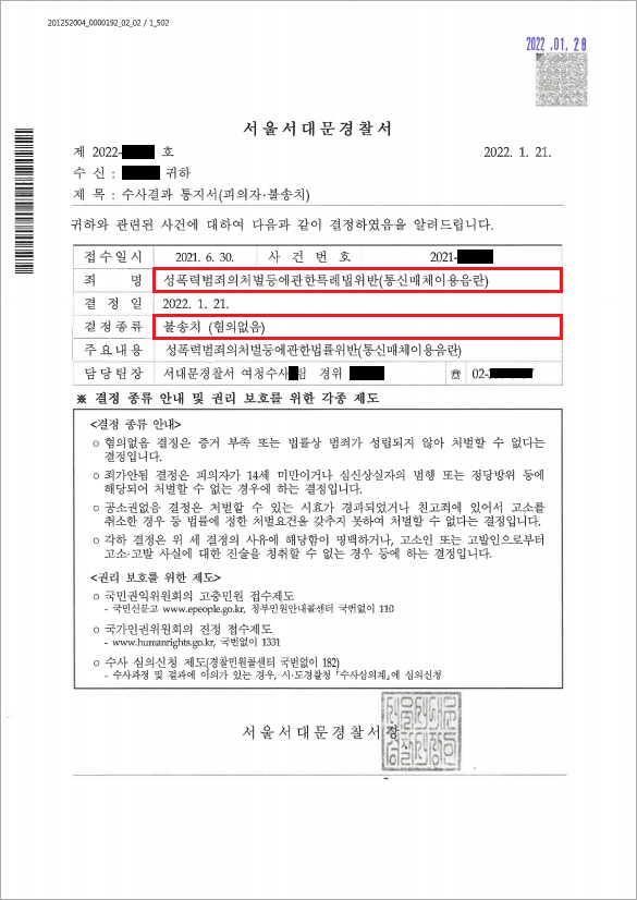 이러한 저의 조력을 바탕으로 A씨는 '불송치(혐의없음)' 결정을 받음으로써 억울하게 성범죄자가 될 위기에서 벗어날 수 있었습니다.
