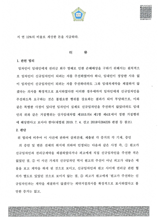 임대인을 변호한 최미선변호사는 관련 법리, 판례에 비추어 본 사건에서 임차인의 주장에 대한 증거가 없음을 조목조목 반박하여 임차인의 부당한 권리금 손해배상 청구를 방어해 드렸습니다.