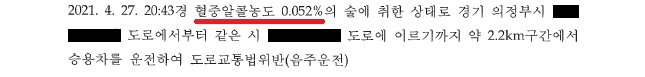 ④ "A씨가 섭취한 알콜의 양이 엄격하게 증명되지 않았다. 따라서 A씨의 운전 당시 혈중알콜농도가 처벌 기준치인 0.03% 미만이었을 가능성을 완전히 배제하기 어려우므로, 도로교통법위반(음주운전)죄는 성립하지 않는다."라는 내용의 변호인의견서를 작성하여 제출하였습니다.