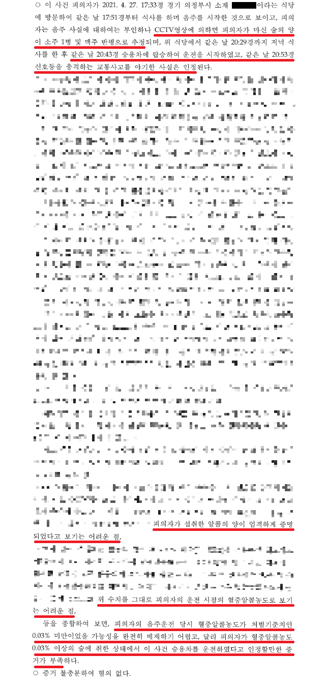 이러한 저의 조력을 바탕으로 A씨는 식당 안에서 일행들과 식사를 하며 술을 따르고 마시는 모습과 이후 식당 밖으로 나가 운전을 하는 모습이 CCTV로 모두 촬영되었음에도 불구하고 '혐의없음(증거불충분)' 처분을 받음으로써 막대한 액수의 '슈퍼카' 수리비를 보험회사에 반환해야 할 위기에서 벗어날 수 있었습니다.