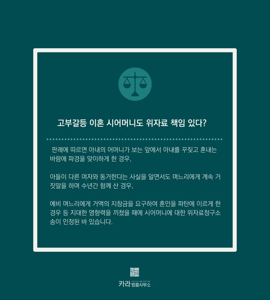과거에는 고부갈등을 이유로 이혼 소송을 제기하더라도 남편의 책임을 더 크게 보았으나, 최근에는 제3자의 가해가 명백히 인정되는 경우에는 제3자에 대한 위자료 청구도 인정되는 예가 늘어나고 있습니다.
