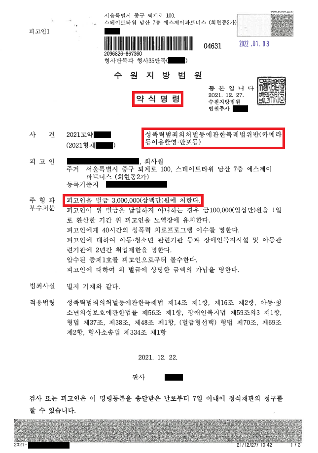 이러한 저의 조력을 바탕으로 A씨는 지하철 역사 안의 불특정 다수의 여성들을 무작위로 촬영하였음에도 불구하고 약식명령으로 벌금형을 선고받음으로써 재판까지 나아가지 않고 사건을 최대한 가볍게 마무리할 수 있었습니다.