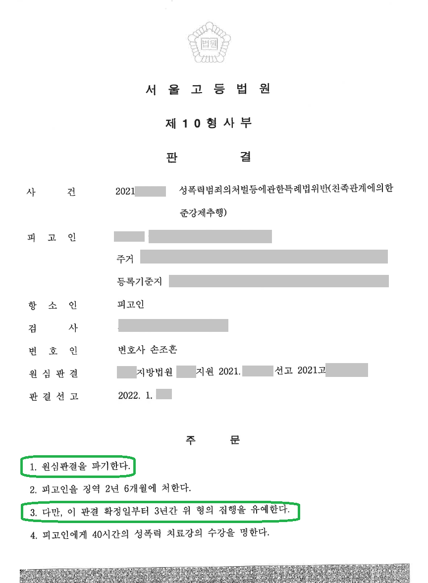 한편 피해자와 피해자의 가족은 항소심 공판에도 직접 방청하면서 재판부에 엄벌을 촉구하셨는데, 손조흔 변호사는 피해자 가족들을 직접 만나 상당히 오랜 시간 대화를 나누며 합의를 설득하였고, 피해자의 허락하에 지방에 있는 피해자 가족의 자택에 찾아가 다시 한 번 진정성 있는 대화를 나눈 끝에, 최종적으로 모든 민사소송, 가압류를 종결하고 원만히 형사합의를 하게 되었습니다.