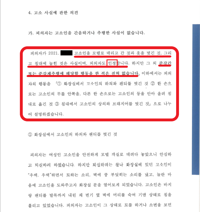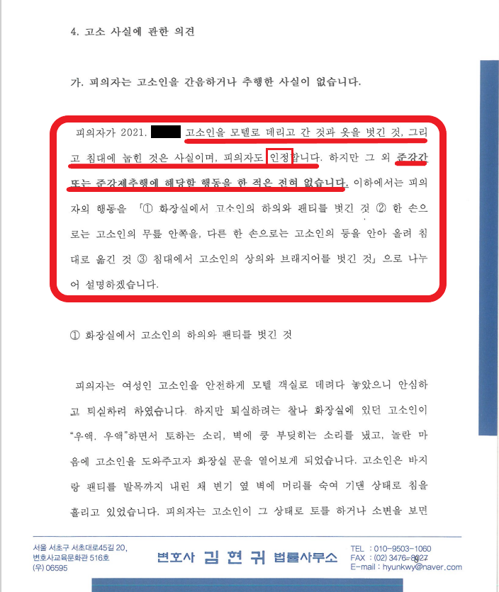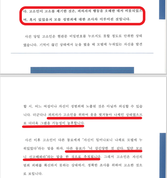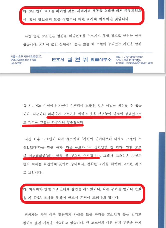 여성은 기억나지 않는다. 강간을 당한 것 같다라고 주장만 하면 수사가 이루어집니다. 이 경우 남성이 오롯이 자기가 그런 일을 한 적이 없다는 것을 증명해야 하는데 매우 어려운 과정입니다. (객실 내부 CCTV가 없기 때문임) 그래서 오로지 사실관계를 상세히 설명하고, 피의자가 기억하는 사실을 초단위로 나열하여 무혐의를 받아내야 합니다.