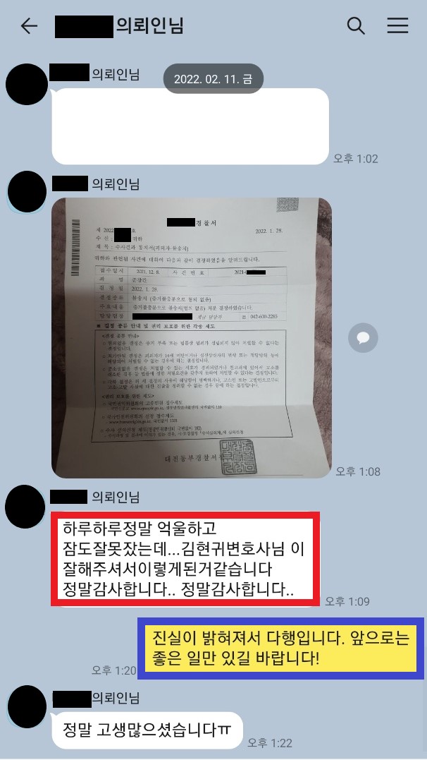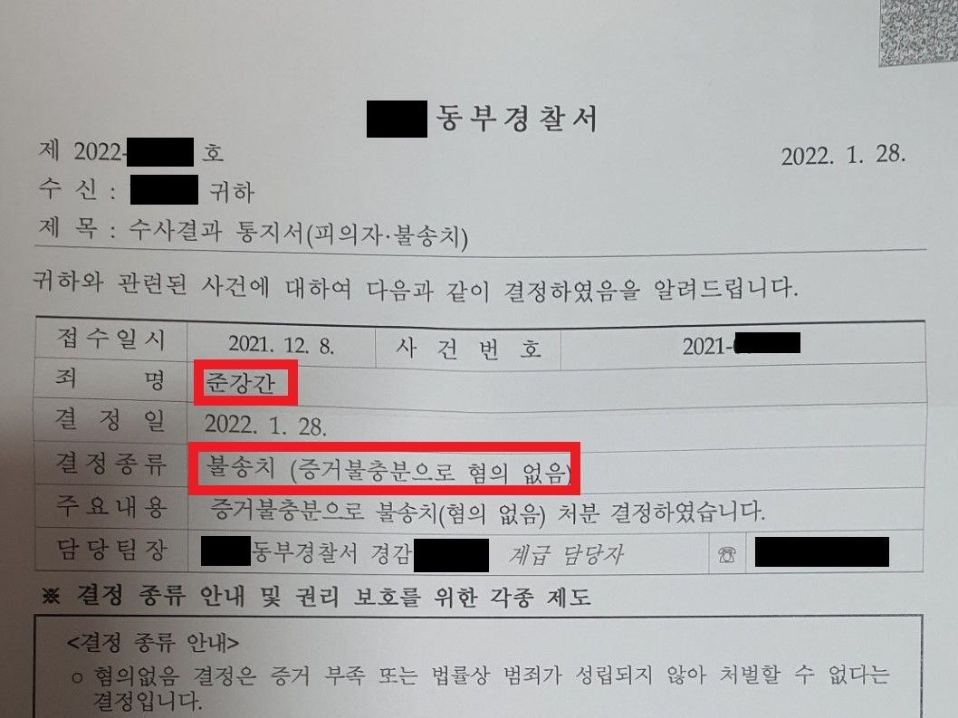 너무 다행히도, 수사관이 의견서 내용과, 변호인의 말을 모두 받아들여, 준강간 혐의에 대해 불송치 결정 하였습니다. 즉 아예 송치조차 되지 않고, 전과도 없이 사건이 종결되었습니다. (송치되어 버렸다면 거의 4~5개월간 기소와 - 재판 과정을 겪어야 했다) 이로서 A는 사건 발생 후 2달만에 일상으로 복귀하였습니다.