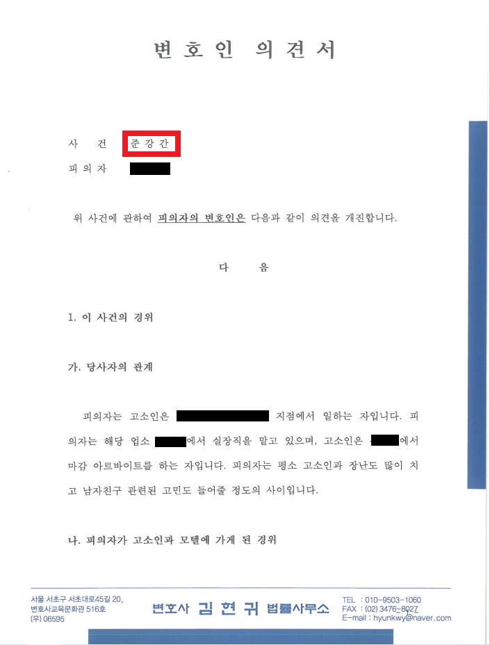 A의 입장을 최대한 상세히 담아 변호인의견서를 작성하여 제출하였습니다. 그 내용에는 아래의 내용을 충실히 담았습니다.