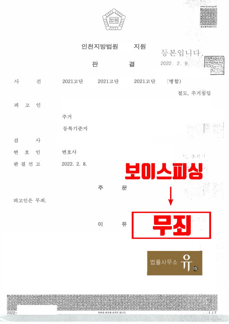 인천지방법원 부천지원은 법률사무소 유(唯) 형사전문변호사가 작성하여 제출한 변호인의견서등의 내용을 대폭 수용하여 의뢰인에게 무죄판결을 선고하였습니다.