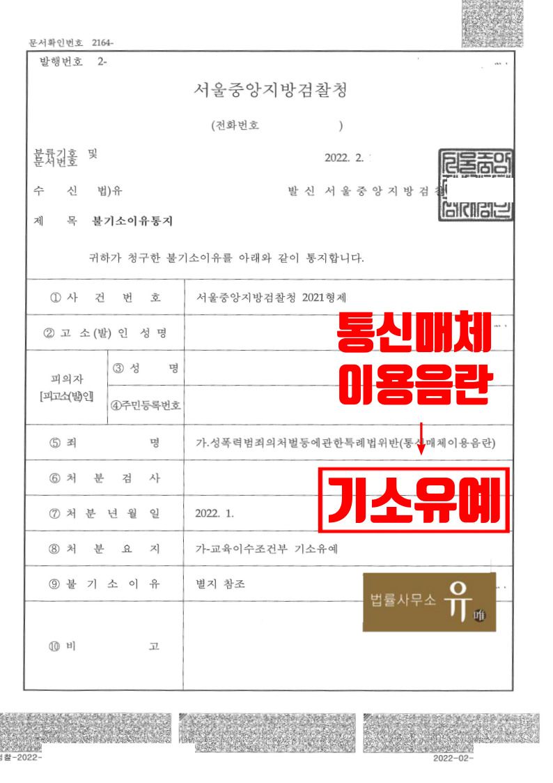 서울중앙지방검찰청은 법률사무소 유(唯) 형사전문변호사가 작성한 변호인의견서 내용을 대폭 반영하여 피의자(의뢰인)에게 기소유예처분을 하였습니다.