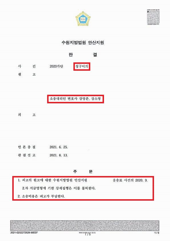 안산지원에서는 저희 주장을 모두 받아들여 상대방이 법인을 상대로 확정받은 지급명령의 효력을 배제하는 결정을 내렸습니다(전부 승소).