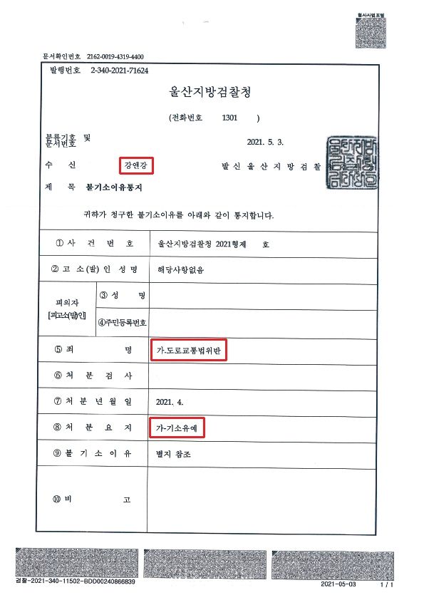 그 결과 울산지방검찰청은 본 변호인의 주장을 모두 받아들여 기소를 유예하는 불기소처분이 내려졌습니다.
