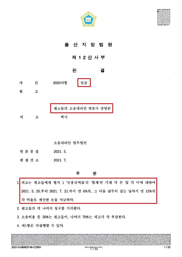 울산지방법원에서는 저희 사무실의 주장을 받아들여 최저임금액을 산정하여 미지급 퇴직금과 지연이자를 피고가 원고들에게 지급하도록 승소 판결을 선고하였습니다.