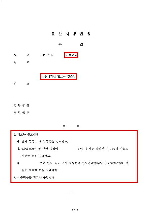 그 결과 울산지방법원은 점유이전금지가처분 및 건물 인도 소송에 대하여 피고에게 부동산 인도 및 임대료 지급, 소송비용 전부 부담을 명하는 판결을 하였고 의뢰인님께서는 전부 승소하시게 되었습니다.