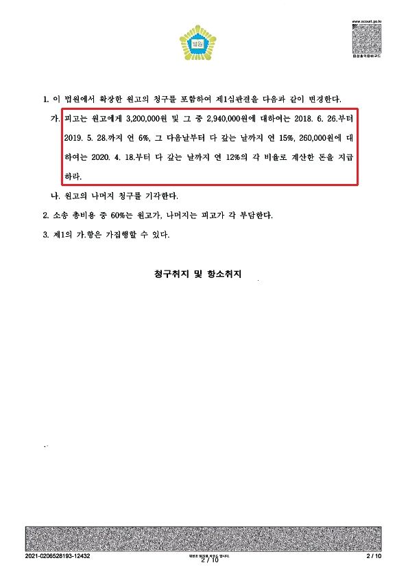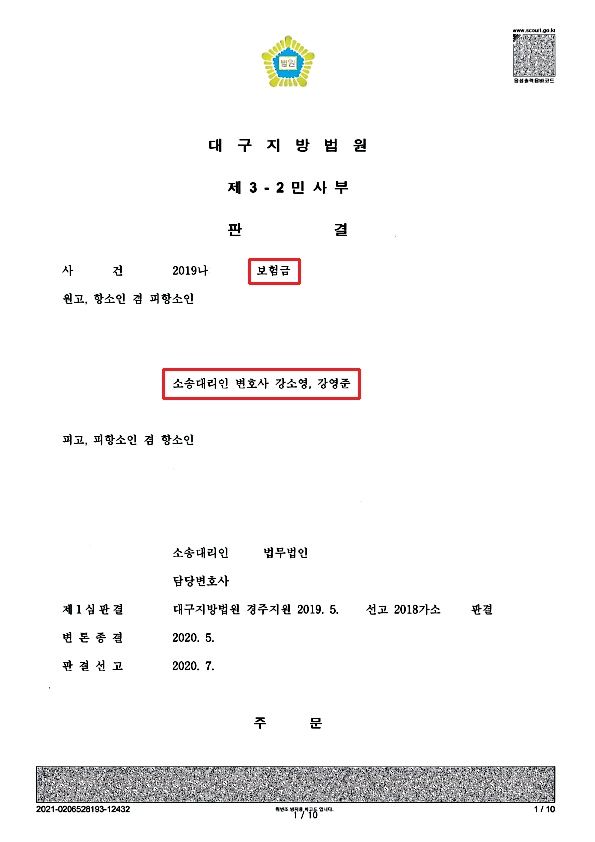 저희 의뢰인께서는 1심에서 원하는 결과를 얻지 못하였고 억울함에 저희 사무실을 찾아서 항소심을 진행하게 되었는바 저희 사무실에서는 감정서에 감정의가 사용한 '보존적'이라는 문구는 '수술적'이라는 표현과 대치되는 '비수술적'이라는 의미로 사용한 것으로 해석되고, 비수술적 치료라는 이유로 치료를 직접적인 목적으로 한 것이 아니라고 볼 수 없음을 적극 피력 및 입증하였습니다.