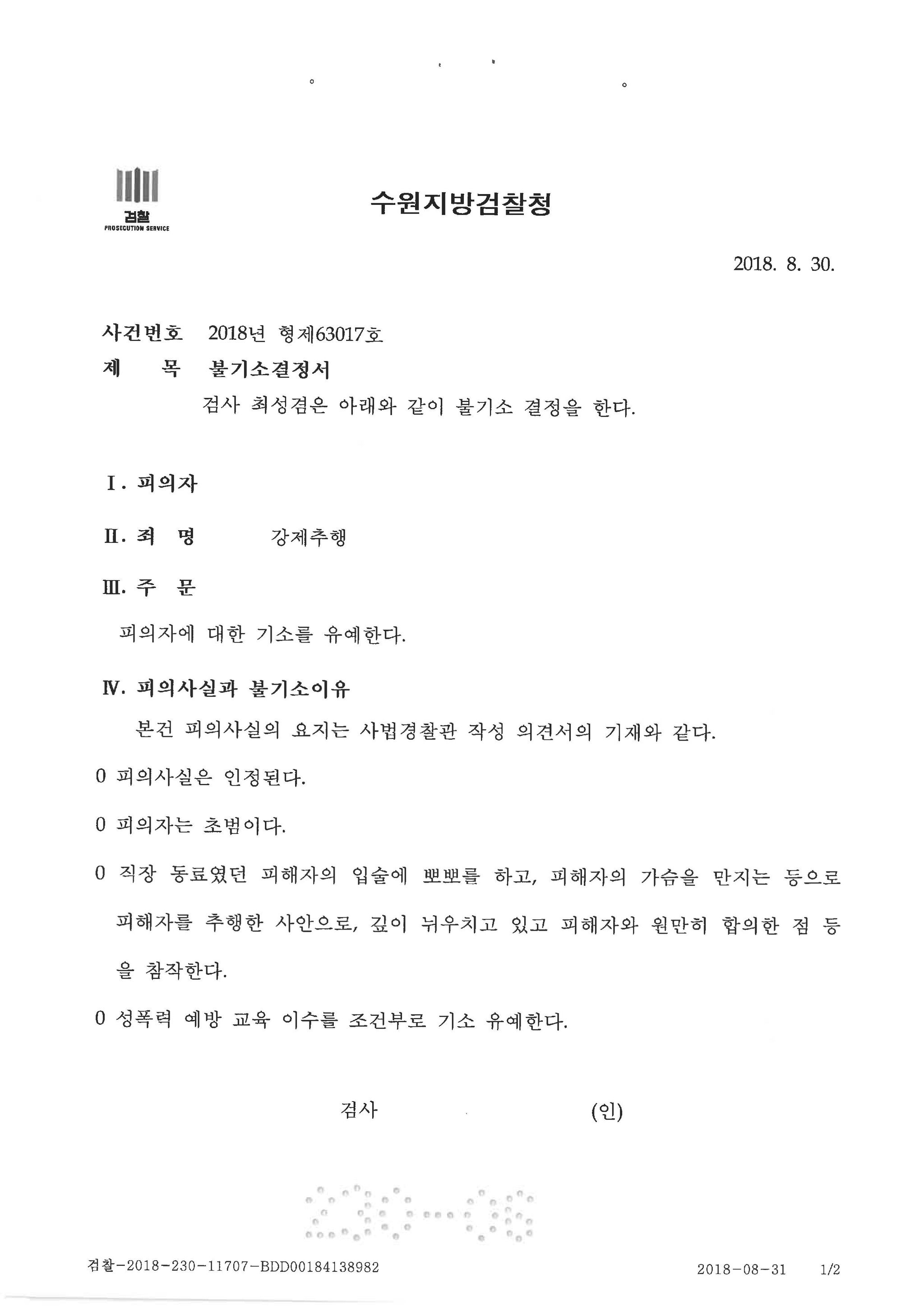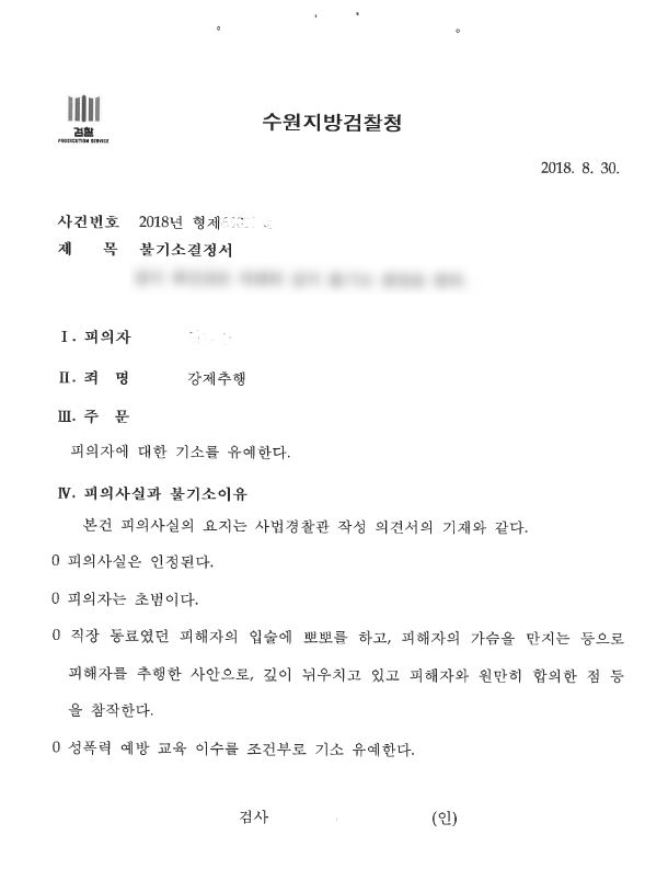수사단계부터 의뢰인은 저의 도움을 받았고, 저는 검찰이 기소하기 전에 조속히 피해자와 원만한 합의를 이끌어 내어 피해자의 처벌불원서와 함께 수많은 사건을 처리한 경험을 바탕으로 저만의 노하우가 담긴 양형 자료를 세심히 정리하여 제출하였고, 결국 재판까지 가지 않고 검사로부터 성폭력 교육이수를 조건으로 기소유예 처분을 받을 수 있었습니다.