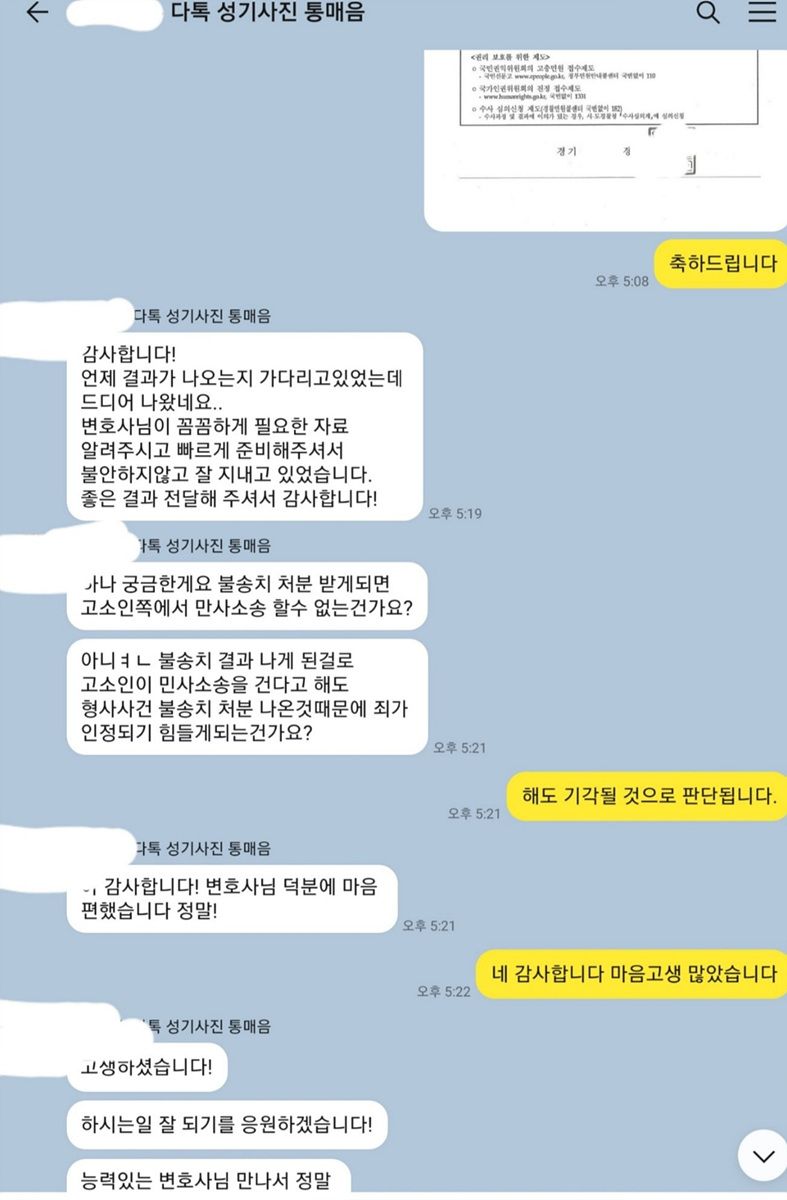이 사건의 경우 의뢰인의 신분이 걸려 있는 사안이고 수위가 상당히 높아 난이도가 높은 사안이라는 생각을 하였습니다. 그럼에도 불구하고 상담이 들어왔을 때 충분히 무혐의로 종결시킬 수 있겠다고 판단되었기 때문에 수임을 하였습니다. 이전에 게임 중에 이보다 높은 수위의 채팅이 이루어진 사안에 통매음에 대해서는 무혐의를 받은 적이 있었습니다(모욕으로 송치되었다가 합의된 사안이어서 위 표에는 없음). 신분이 걸려 있었기 때문인지 여러 변호사의 상담을 거쳤고 그 과정에서 다른 말을 들었기 때문인지, 무혐의가 가능한 사안이라는 제 말에 처음에는 의문이 있지만 대안이 없고 변호사 중에 가장 낫다는 정도의 생각을 하는 것으로 느껴졌습니다.