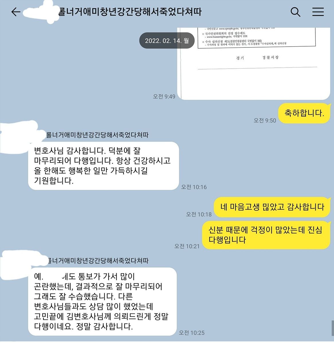 제 일정이 빡빡해서 크리스마스에 조사일정을 잡았는데 결과적으로 좋은 소식을 전해줄 수 있어 다행이라는 생각입니다. 설 연휴, 추석 연휴, 크리스마스 연휴 등 일반적으로 조사일정이 없는 연휴기간에 조사일정을 잡았던 사건들은 이상하게도 백프로 결과가 좋았는데 이 사안 역시 좋은 결과로 마무리되었습니다.