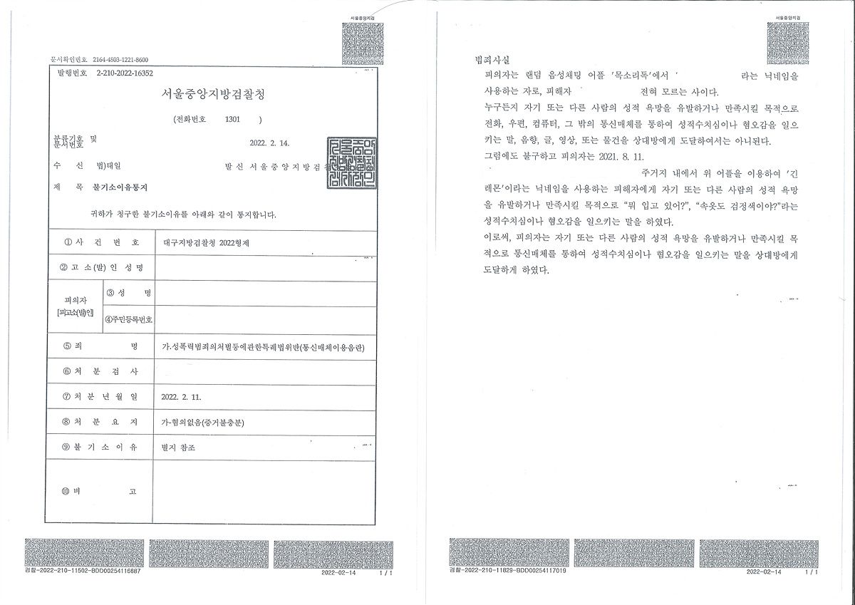 1. 성폭법 통매음 국민어장 성기사진 전송 불기소
