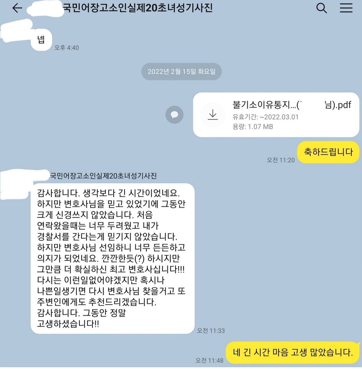 이 사안과 관련하여 국민어장과 관련한 어플과 관련된 자료, 의뢰인과 관련된 자료들을 다수 수집하여 충실한 의견서를 사전에 제출하고 조사에 임하였습니다. 고소인이 실제로 20대초반 여성에 해당하였기 때문인지 피의자가 조사에 제가 입회하면서 받은 느낌은 이미 유죄라고 결론을 내려놓고 문답을 한다는 생각이 들었습니다. 실제 경찰수사관, 검사 등의 법적 판단에 관한 의견이 항상 바른 것은 아니고 제 의견서와 다른 결론이 내려지는 경우가 종종 있습니다.