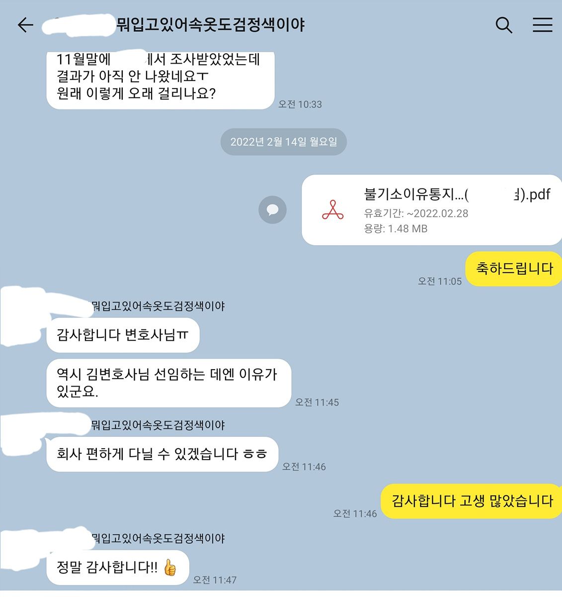 이 사건의 경우 조사를 받고 나오면서 의뢰인에게 "수사관의 태도로 보아 기소의견으로 송치할 것이다. 다만 검찰에서 이 사건을 기소하기는 어려울 것이다"라고 의뢰인에게 안내하였습니다. 이 사건은 기소된다고 하더라도 무죄판결이 충분히 가능하다고 법리적으로 판단되었고 이를 뒷받침할 수 있는 자료도 충실히 수집해 두어 큰 걱정은 하지 않았습니다.