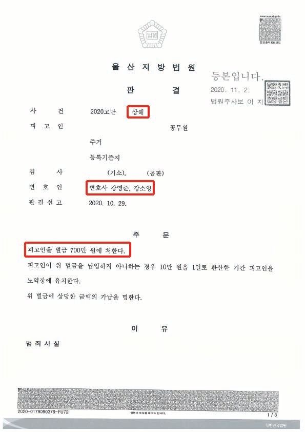울산지방법원에서는 저희 사무실의 양형 주장들을 적극적으로 고려하여 의뢰인에게 벌금형을 선고하였습니다.