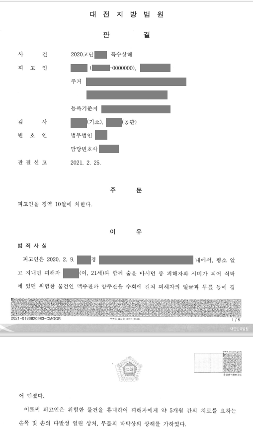 의뢰인은 사건이 쉽게 종결될 것 같지 않다고 느끼고 변호인을 선임하였고, 저는 병원 진료기록을 바탕으로 적극적으로 변론하여 최초에 검사가 특수폭행죄로 기소했던 것을 5개월의 치료가 필요한 상해를 입힌 특수상해죄로 공소장 변경을 이끌어냈습니다.