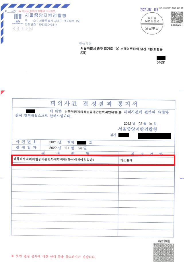 이러한 저의 조력을 바탕으로 A씨는 B씨와 합의하지 않고 혐의를 적극 다투었음에도 불구하고 아무 조건도 없는 '기소유예' 처분을 받음으로써 법적 불이익을 최소화하면서 성범죄 전과자가 될 위기에서 벗어날 수 있었습니다.