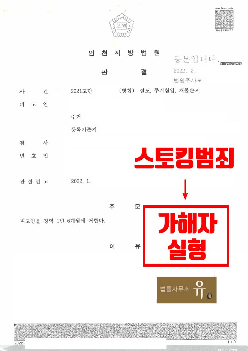 인천지방법원은 법률사무소 유(唯) 스토킹범죄전문변호사가 작성한 고소장 및 고소보충의견서 등의 내용을 받아들여 가해자에 대하여 중한 실형을 선고하였습니다.