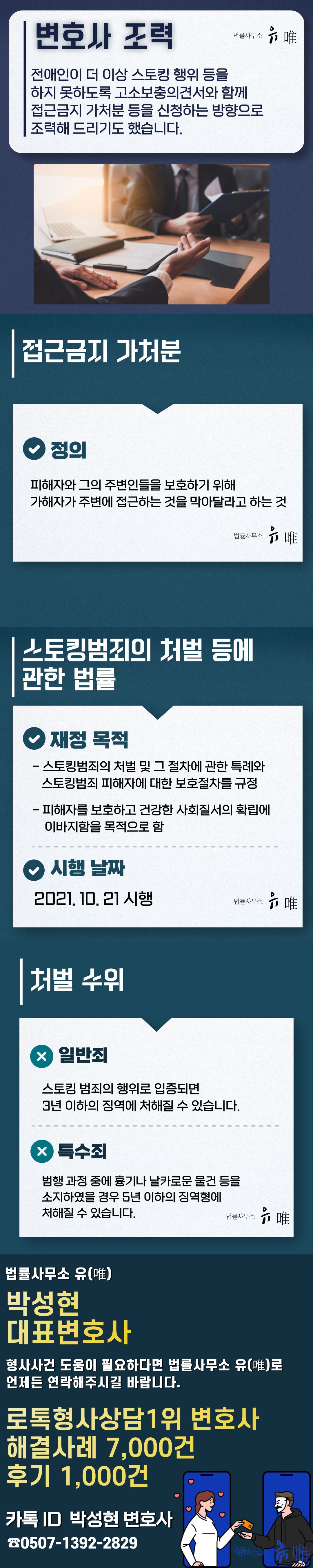 법률사무소 유(唯)의 스토킹범죄전문변호사는 의뢰인과의 신속한 상담을 통해 사건의 경위 등을 정확하게 파악한 후 피해자인 의뢰인이 가해자로부터 당하고 있는 피해사실들을 구체적으로 적시하여 가해자가 더 이상 스토킹 행위 등을 하지 못하도록 가해자에 대한 고소는 물론 엄벌을 요구하는 고소보충의견서 등을 수사기관에 제출하고 의뢰인의 피해보상을 위해 노력하는 등의 방법으로 의뢰인을 조력하였습니다.