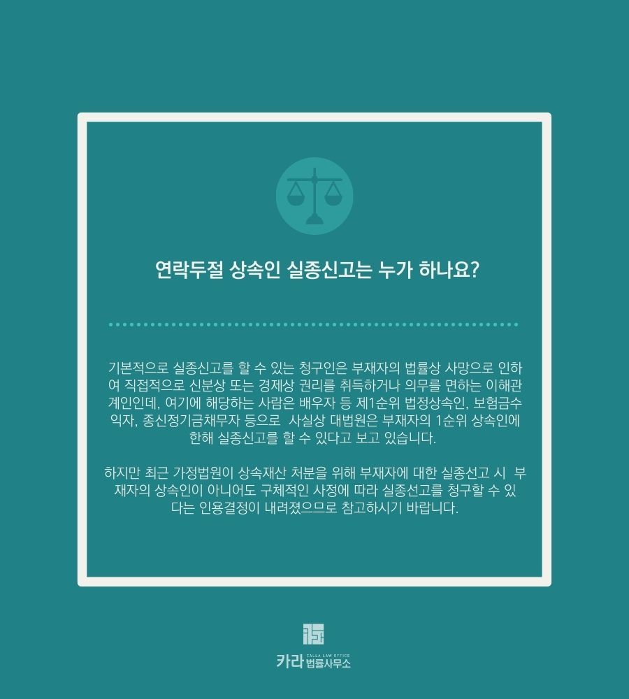 이에 법원이 이러한 주장을 받아들여 이례적으로 부재자의 상속인이 아니어도 구체적인 사정에 따라 실종선고를 청구할 수 있다는 인용결정을 내렸습니다.