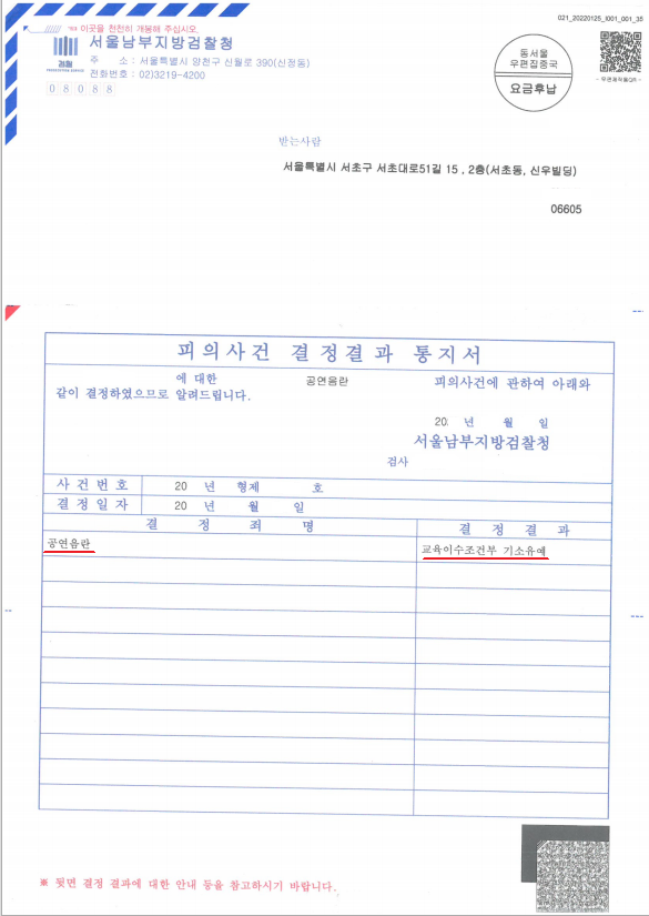 의뢰인님께서는 경찰 조사에서부터 김준환 변호사와 함께 조사를 진행하시고, 김준환 변호사가 안내해드린 양형자료들과 선처를 호소하는 변호인의견서 제출을 통해 서울남부지방검찰청은 의뢰인님에게 "기소유예처분"을 내렸습니다. 이로 인해 의뢰인님께서는 전과 기록이 남지도 않고, 신상정보 공개, 고지, 등록 대상도 되지 않았습니다.