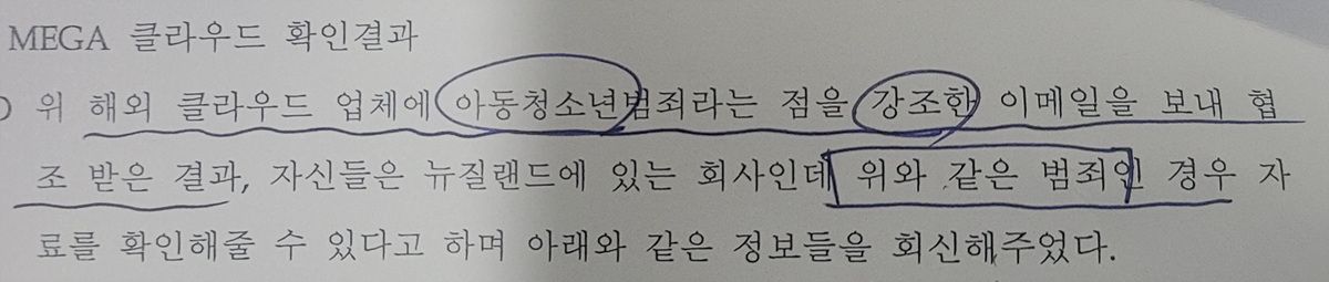 윤XXX, 돈XXX 영상에 대하여는 서울경찰청에서 출처를 가리지 않고 나오는 대로 수사를 한다는 입장이었다는 점에 대해서는 언급한 바가 있습니다. 그래서 메가클라우드에 윤XXX 영상을 들여오기했던 경우에 추후 문제될 수 있는지 문의가 있기도 하였습니다. 당시에는 가능성이 없지는 않는 것 같다고 답변을 하기도 하였습니다. 그러나 아래와 같이 메가클라우드에 '아동청소년범죄'임을 강조하였고, 그러한 범죄라면 확인해줄 수 있다고 한 점을 본다면 성인영상인 윤XXX, 돈XXX 영상의 경우 메가클라우드와 관련하여서는 너무 걱정할 필요가 없다고 판단됩니다.