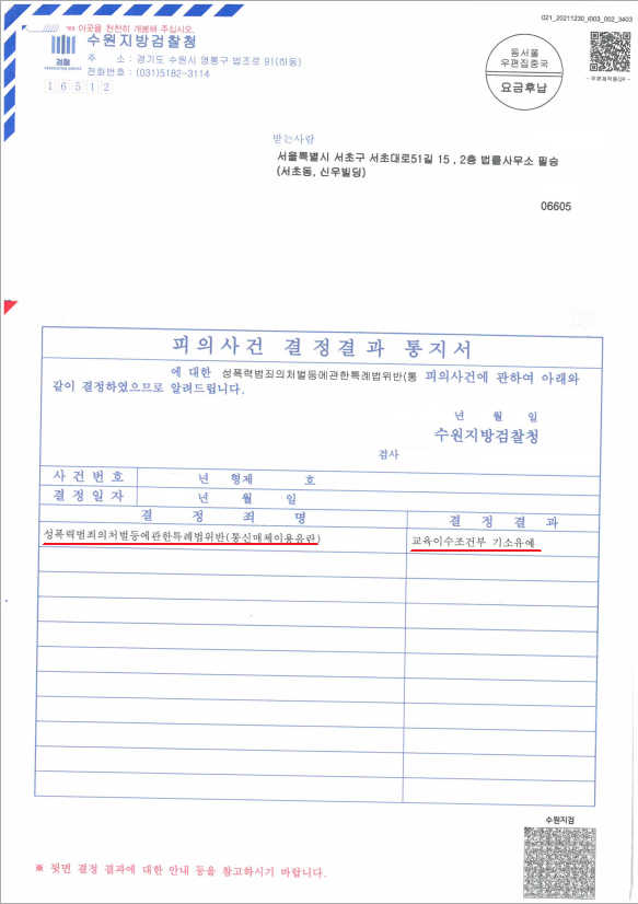 이에 수원지방검찰청은 의뢰인님에게 아무런 전과 기록이 생기지 않는 "기소유예"처분을 내렸습니다.