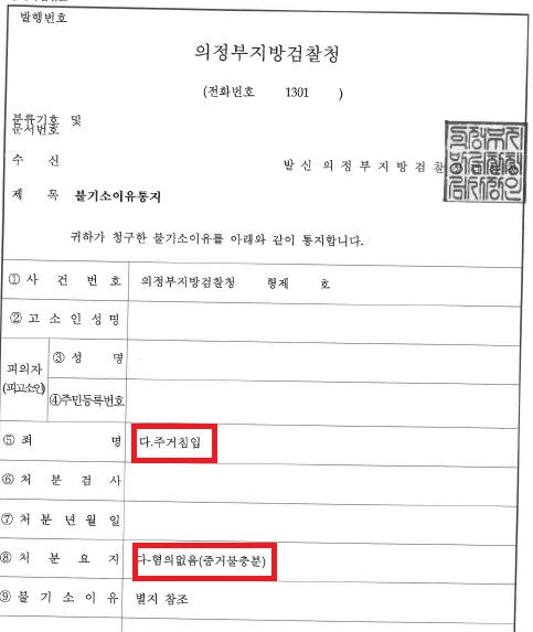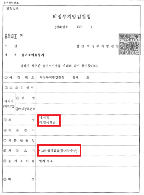 결국 담당 검사는 본 변호인의 주장을 전부 받아들여 의뢰인의 1) 폭행, 2) 사실적시 명예훼손/ 의뢰인 남편의 3) 주거침입 각 혐의에 대해 모두 혐의없음 처분을 하였습니다.